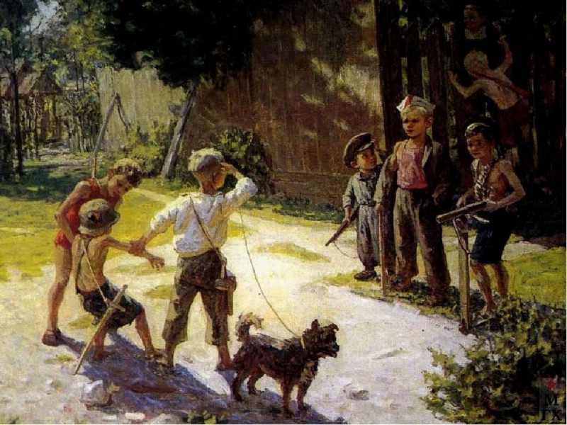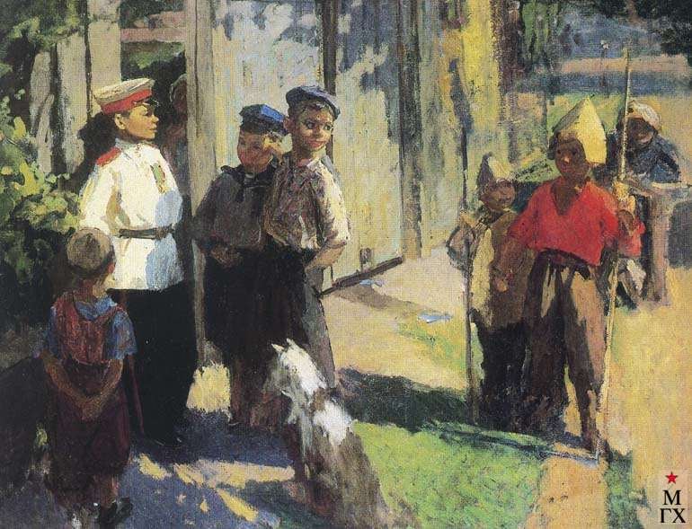 И давайте вернемся к собственно нашему триптиху. Все-таки можно ли объединить три этих картины в рассказ с одним и тем же персонажем? Ну, а если сюжеты картин расположить немного в ином порядке? Вдруг автор вначале изобразил финал истории и лишь затем то, с чего все начиналось? Тогда эволюция вчерашнего двоечника в бравого суворовца выглядит вполне естественной.