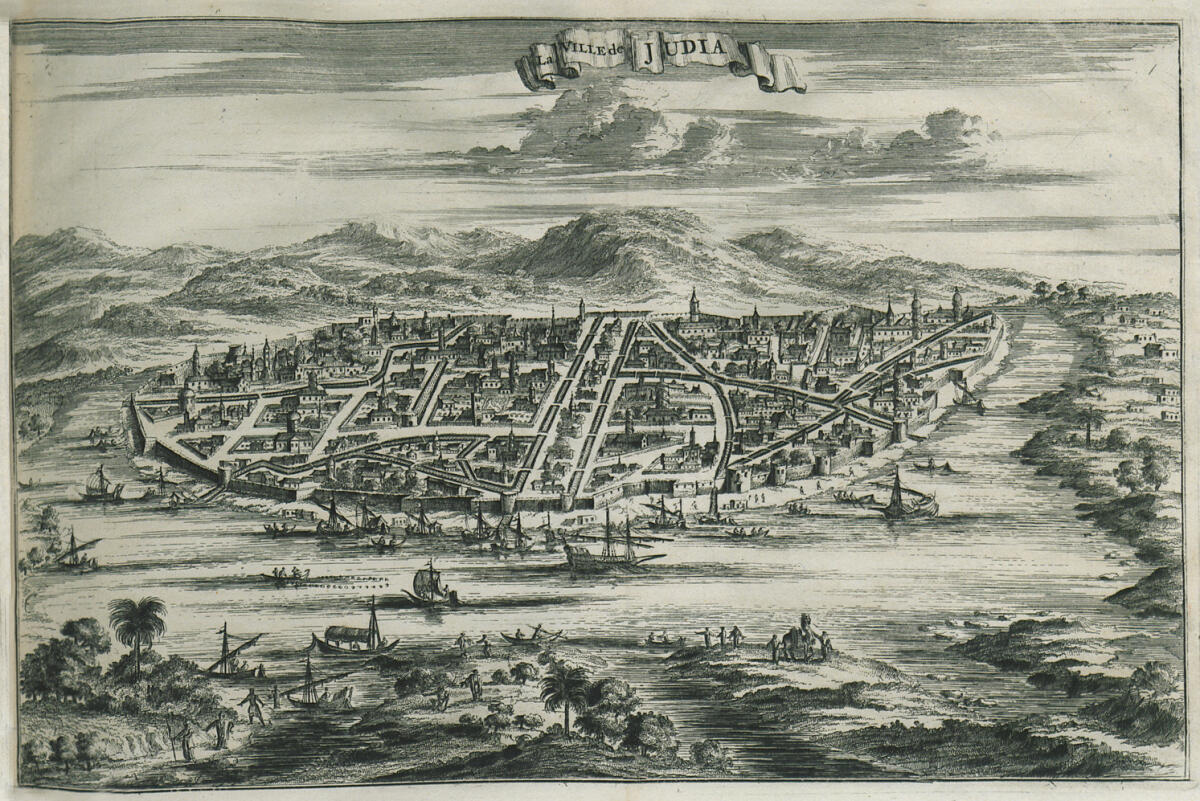 Украшена тысячами церквей, монастырей и золоченых башен. В Аютии есть улицы, которые едва можно пройти в течение трех часов; город кругом обтекает канал, шириной в два ружейных выстрела (?); сиамский король со своим двором помещается в великолепном дворце, построенном внутри города и обнесенном стенами, не считаясь ни с какими издержками, так что на него можно смотреть, как на чудо.