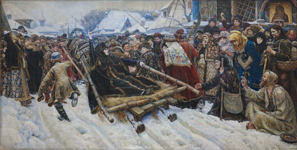 В «Боярыне Морозовой» белизна снега — как свет прожектора, высвечивающий трагедию. В его работах зима — не декорация, а сильный характер. Она словно подтверждает: история России писалась на холоде, среди сугробов, под серым небом.