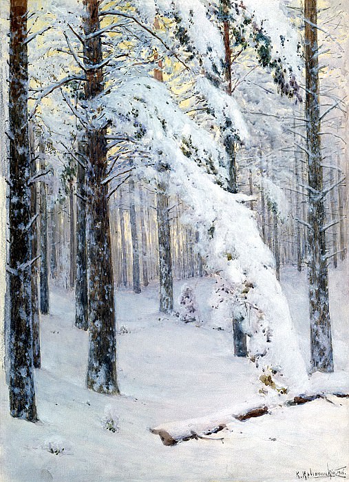 В «Лесе зимой» Константина Крыжицкого снег плотный, уверенный, морозный. Он создаёт ощущение пространства, которое знает себе цену. Нет ярмарочной лёгкости и декадентской тонкости — только честность природы. Снег кажется прямым и строгим, но в его белизне есть прозрачность, которая делает зиму не пугающей, а ясной.