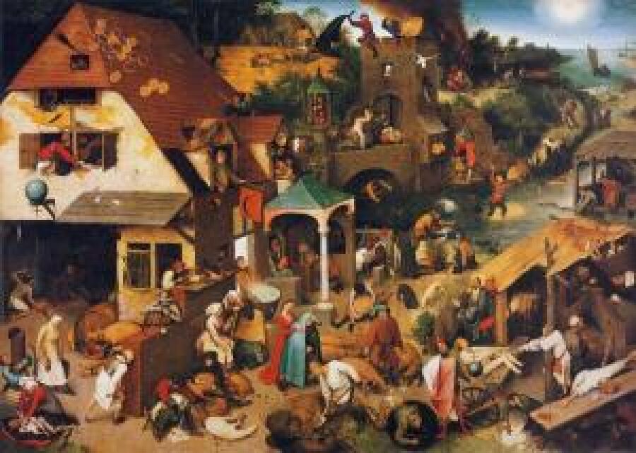 А меж этими датами, в 1559 году, нечто вроде Деревни пословиц создает живописец Питер Брейгель Старший — Брейгель Мужицкий. Эта картина так и называется — «Нидерландские пословицы». Само полотно небольшое, 117 на 164 см. И в таком малом пространстве художник сумел разместить более сотни сюжетов-миниатюр! Попробуем на небольшой репродукции рассмотреть хотя бы некоторые сюжеты.