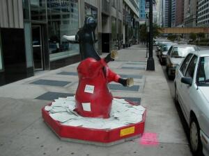 Ну, а как тут без Чикаго — мясной столицы мира? И уже через год, в октябре 1999 года на улицах города было выставлено 300 потрясающих скульптур, принесших в казну города 50 миллионов долларов. Чикагская биржа выделила 100.000 долларов на транспортировку и монтаж скульптур, столько же художники получили в виде гранта от муниципалитета города. При затратах в 200.000 на организацию шоу-парада прибыль в 50 миллионов долларов смотрится сверхфантастической. Из 300 коровок было отобрано 30 лучших и они ушли на аукционе по цене от 2.500 до 11.000 долларов за скульптуру. Мэр Чикаго Ричард Дейли распорядился этими деньгами в пользу поддержки молодых представителей школы искусства.