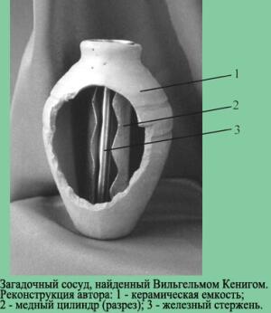 В 1936 году при раскопках близ Багдада австрийский археолог Вильгельм Кениг обнаружил кувшин, изготовленный две тысячи лет назад парфянским гончаром. Внутри невзрачного сосуда высотой 15 сантиметров находился медный цилиндр, в который был вставлен железный стержень. - здесь