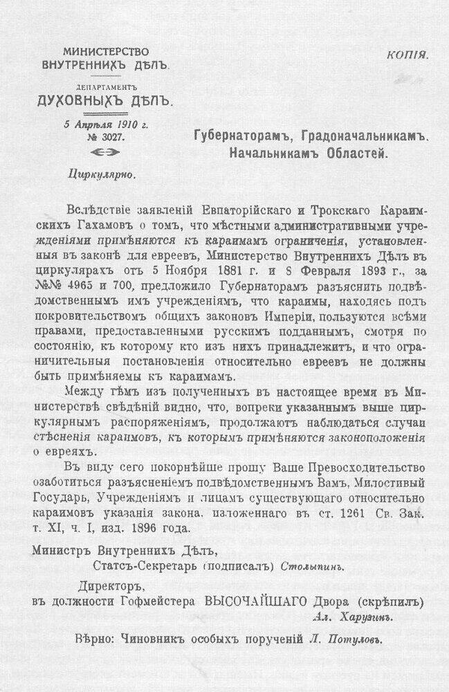 В дореволюционных паспортах у караимов было записано Иудейскаго Вероисповедания Караимскаго Толку. Моя бабушка сохраняла паспортную книжку своего отца, моего прадеда Соломона Габая (Троупе). Абрахаму бен Шмуэлю риби Фирковичу, га-Наси Иерусалимскому и в голову бы не пришло считать себя тюрком. Царь не преследовал за кровь, он преследовал за веру. Это вот при Советской Власти стали преследовать за кровь и некоторые негодяи стали считать себя тюрками. По идее, мне ультрафиолетово, кем себя эти красавцы считают. Настоящий къараим прекрасно знает, кто он такой, и антисемитов не боится.