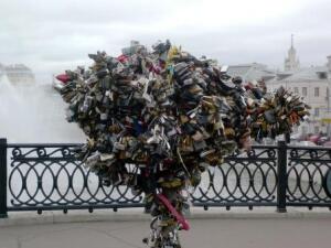 Я в Китае видела подобную композицию из замков, которые молодожены вешают на Великую Китайскую стену, а ключ выбрасывают со стены соответственно. Наверное москвичам подражают