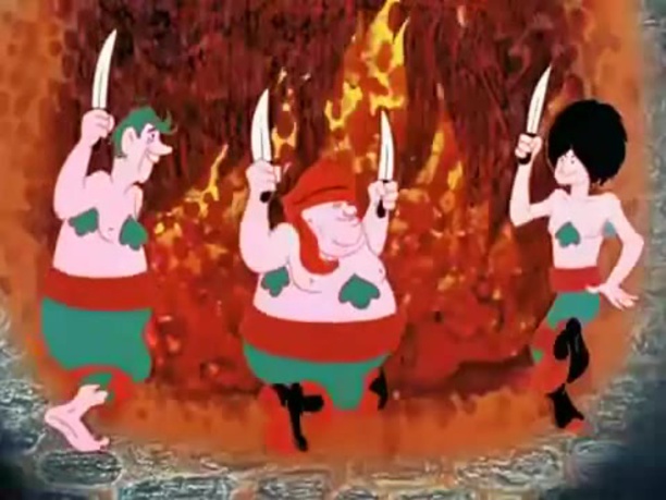 По большому счету, и весь мультфильм от начала до конца — дань ценностям движения хиппи. Вспомните, какой образ жизни ведут его герои. Они беспечны и легкомысленны, не обременяют себя заботами о завтрашнем дне, не приучены ни к какому труду, совсем как «дети цветов». Музыка, путешествия, любовь — вот их повседневные занятия. Распевая гимны свободе, иногда они позволяют себе виртуозные хулиганства: чего стоят одни издевательства над бедным королем!