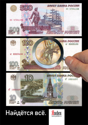 Лаура Ли, памятник Петру Первому - на пятисотке. Аполлон на Большом театре - на сотке. Памятник Ярославу Мудрому - на тысячной. Памятник Муравьеву-Амурскому - на пятитысячной. А вообще-то на нынешних купюрах - виды городов (Красноярск - 10, Питер - 50, Москва - 100, Архангельск - 500, Ярославль - 1000, Хабаровск - 5000). Плакат студии Лебедева: