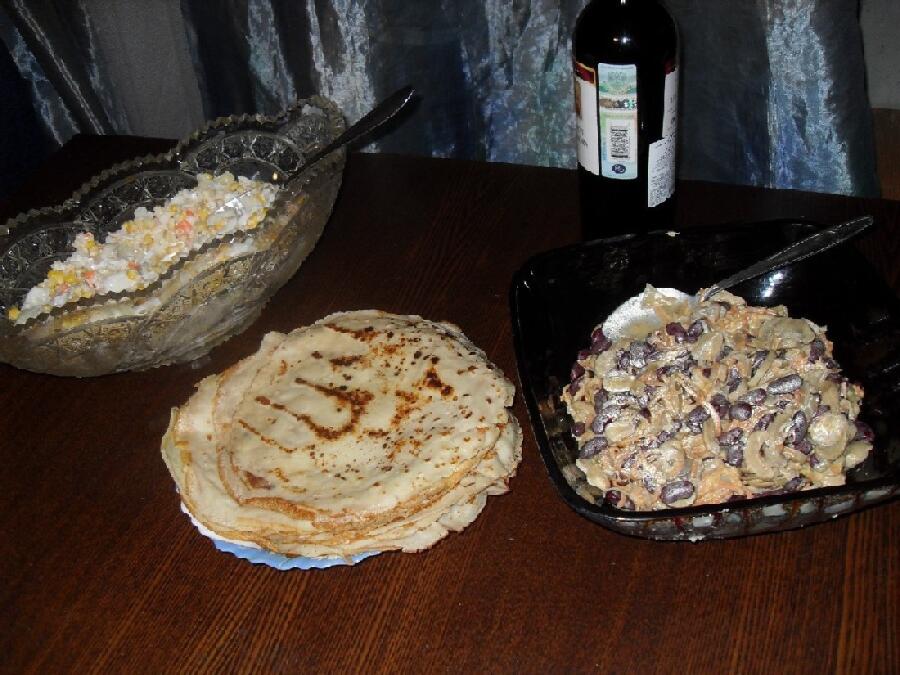 Одну я тебе сейчас дам сюда. Если хочешь - попроси ее в текст, мне не жалко. Но вот именно вчерашние пока не могу - у меня комп не видит почему-то фотоаппарат. Здесь блины с такими салатами...