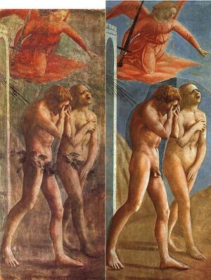 Это сделали, к примеру, в Сикстинской капелле, которую великий Микеланджело разрисовывал без всякого стыда. И на знаменитой фреске Мазаччо «Изгнание из рая» (1428), одной из первых картин эпохи Возрождения, Адама и Еву приодели в листочки, как бы с ближайшего куста. В ходе реставрации в 1980 году фреске возвратили прежний вид и убрали пририсованные цензорами листочки. Надо сказать, что северные художники были не в пример скромнее итальянцев. Например, голландец Ян ван Эйк (1390−1441) на знаменитом алтаре из Гента, который он создал почти одновременно с Мазаччо, в 1432 году, изобразил Адама и Еву прикрывающимися листьями смоковницы, как написано в Библии.