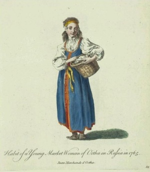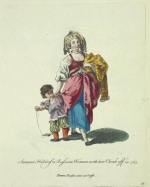 Тем не менее, если немного отстраниться от «манеры изложения» французского художника и гравера и вглядеться в одежду персонажей его картин, остается странное и праздничное чувство. Исключительно яркая и разнообразная одежда на героях. Например, сцена из русской повседневной жизни — неужели это рисунок с натуры? С русской натуры, не с итальянской? Смотришь на эти работы очень талантливого мастера (например, в комментариях) и диву даешься. Ну ладно томные барышни — это в тогдашней традиции, но сколько интересных, скрупулезно выписанных одеяний, от верхней одежды до головных уборов.