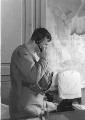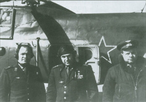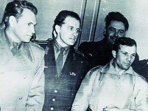 С места посадки Ю.Гагарин был доставлен вертолётом на авиабазу "Энгельс". Пилотировал вертолёт майор С.Хитрин и борттехник капитан В.Галкин. В кабине был Герой Советского Союза полковник Осипов В.В. и нач.гарнизона -генерал-лейтенант Бровко И.К. (все офицеры из в/ч 62648) На фото слева направо- майор С. Хитрин-Герой Советского Союза полковник Осипов В.В.- борттехник капитан Галкин В.В.