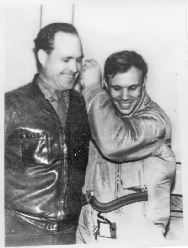 Как только операторы обнаружили цель над Волгой, он помчался к вертолету. Борттехник Галкин вмиг запустил двигатель. Можно лететь. Связавшись по рации с командным пунктом, Хитрин запросил разрешение на взлет. Но командир части генерал-лейтенант Бровко приказал без него не взлетать. Послали машину на квартиру за генералом. Вместе с генералом в кабину сел полковник Осипов, Герой Советского Союза. Теперь уже пассажиры торопили Хитрина – мол, давай-давай.Машину, на которой ракетчики везли Гагарина в Энгельс, Хитрин догнал быстро. Посадив на борт Ю.Гагарина взяли курс на "Базу". На фото С.Хитрин и Ю.Гагарин. Они были знакомы ещё при парашютной подготовке отряда космонавтов на авиабазе "Энгельс" в 1960г.