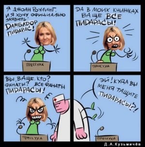 Роулинг нередко обвиняли в том, что она исповедует западные либеральные ценности. На что я говорил — а что она, по-вашему, должна исповедовать? Коммунистические ценности? Православные? И что, конкретно, плохого в ее ценностях? И тут разошедшаяся Роулинг после выхода 7-й книги заявляет, что один из главных положительных персонажей сказки — волшебник Дамблдор… оказывается, гей. Вот и славно. Не проясни она это в интервью, мы так бы и остались в своем «гомофобском» неведении. Господи, ну зачем? Ну можно хоть детскую сказку избавить от прекраснодушных геев? Хорошо, что Вольдеморт не оказался сталинистом…