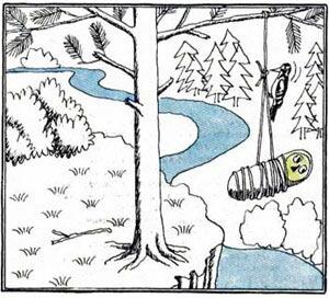 А дятел в это время перерубил клювом узел. Мурзилка стал рускручиваться, одновременно раскачиваясь и улетел от ветра на ближайшее дерево.