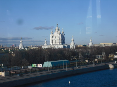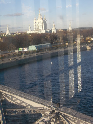 Вид с верхнего этажа Большеохтинской башни на Смольный собор (фото через окно)