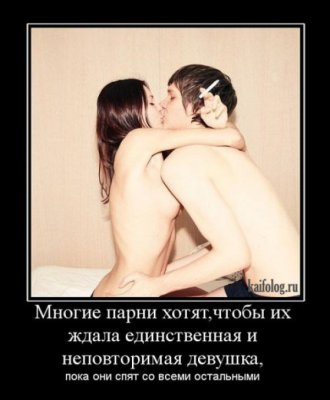 И потом есть понятие -- не нагулялся! У кого-то жена-девственница, которую в 20 замуж взяли, до тридцати довольна браком, а потом ррраз -- и поддалась искушению! У кого-то муж -- девственник, и у него ррраз -- и встал на другую! И всё... Ради чего это всё было? Ради плёночки? А потом с другими делиться?