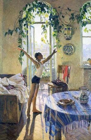 Девочка-подросток тянется вверх. Она как бы взлетает… Похоже, что она танцует. Источника музыки не видно, скорее всего, это радио. Ее лицо выражает не радость, оно как бы тревожное. Не очень, но все-таки. Видимо, такая музыка. Ей хочется вспорхнуть, улететь вслед за звуками.