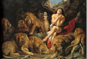 Вот этот момент — Даниил во рву со львами — изобразил Рубенс. Даниил молится, а львы вокруг него как бы не видят его. Несколько странно выглядят львы — их морды нарисованы с человеческими выражениями. Это не очень вяжется с молитвенным порывом Даниила.