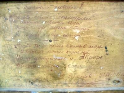 А я вчера снова был на "Соколике", внутреннюю обшивку на нём сейчас меняют - на фанерной задней стенке дивана ходовой рубки рабочие обнаружили запись: