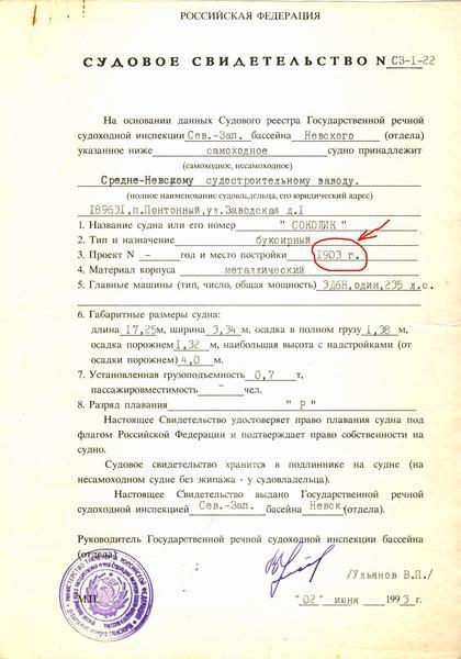 Нашел я нашего искомого в списках 1912 года. Владелец Смирнов И.Ф. (Странно ведь он умер в 1911? - наверное не внесли исправления).№ судна по порядку в списке 2939. № МПС 4470. Имя СОКОЛИК. 15 ном./60 инд. сил. 45х11,2 фут. Корпус, котел, машина постройки 1903 года. Корпус и машина СПб завод Смирнова. Котел Крейтон и Ко. № котла 262 (1903)район плавания Шлисельбург - Кронштадт.