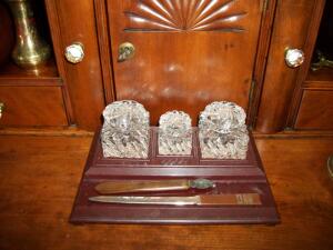 А ещё у нас вот такое наследство живёт на старинном секретере. Не знаю, для чего в наборе целых три чернильницы. И почему чернильница в серединке размером поменьше