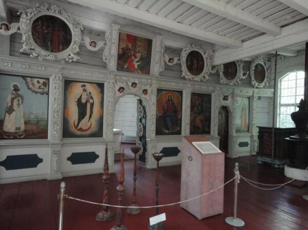 По своему объемно-пространственному решению храм является одноглавым, что, впрочем, неудивительно — данный тип церквей был широко распространен в петровскую эпоху. Стены здания рублены из бруса, кровли тесовые, купола и шпили покрыты железом. Уже внутри церкви, прямо над входом в нее и как бы на втором этаже, находятся закрытые хоры. Это было любимое место Петра I, на котором он обычно располагался во время службы.