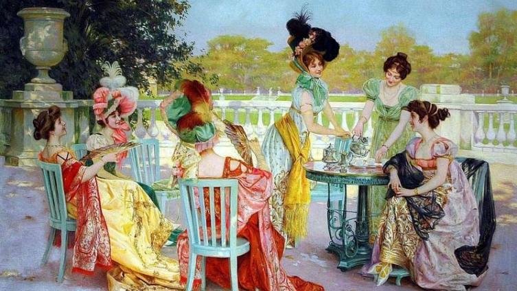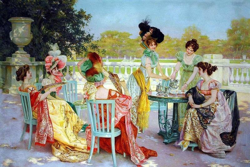 «Послеобеденное чаепитие». Конец лета, листва на деревьях отдает золотом, но жизнь прекрасна! Очаровательные дамы собрались на террасе, сейчас будут пить чай. Как они милы! Какие у них шляпки и прически! А какие платья!