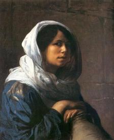 «Египетская водоноска». Большой белый платок или накидка, синее платье с блестящими вставками на плечах. В руках — глиняный кувшин с крышкой и ручкой. Нестарое лицо, скорее всего — незамужняя. Настороженный, если не сказать — враждебный взгляд. Никаких украшений, кроме сережек, никаких специальных эффектов — портрет, что называется, с улицы.