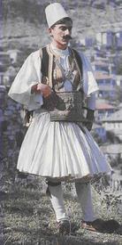 «Албанец в Каире». Молодой, с закрученными вверх усами человек. Он с мушкетом на плече, с саблей наперевес, с двумя гончими на сворке позирует в каком-то переулке Каира. На нем — национальный костюм албанцев: юбка, жилет, широкий пояс, роскошный тюрбан, чувяки.