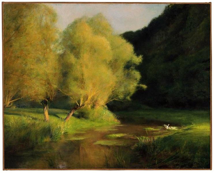 «Ивы у ручья». Лучи заходящего солнца дают глубокую тень от холма, под которым течет местами заросший водорослями ручей. Ивы на пологом берегу ярко высвечены, у берега плещется утка с выводком. Ни ветерка, вода — как зеркало.