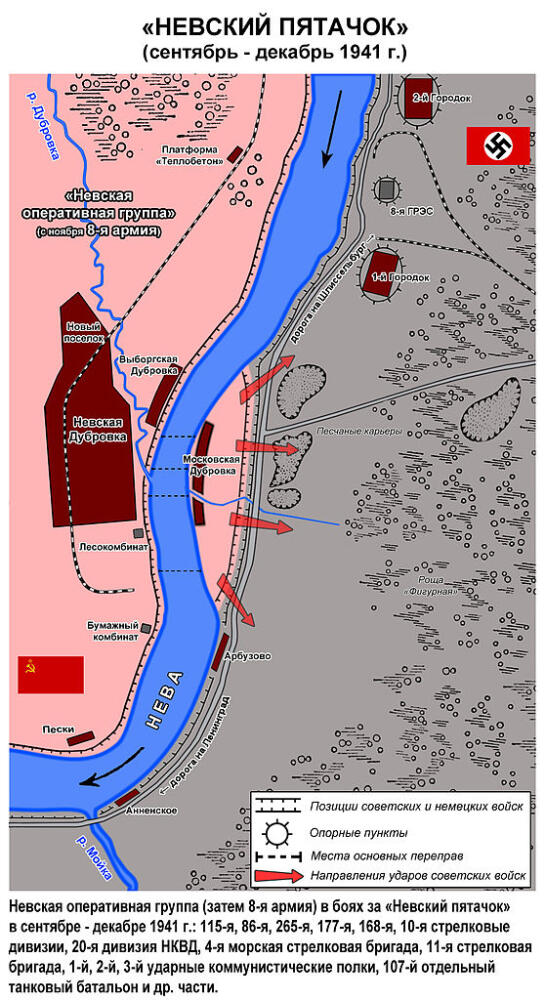 «Невский пятачок», «Невская Дубровка» — эта земля переполнена железом и костями. По маленькому участку земли, всего два километра по левому берегу Невы, ежедневно стреляли, бомбили, атаковали немецкие части. Два года ждали прорыва именно с пятачка. Все силы к нему стянули, а потом советские войска ударили с другой стороны по самому оголенному участку фронта и прорвали блокаду.