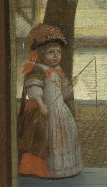 Юная рыбачка обратила свой взор на маму: ее нарядили по другому случаю (может быть, собрались в гости), а она добралась до снасти и решила выйти поразвлечься, пока мама занимается письмом. Она понимает, что делает не то, что хотела бы мама: у нее очень выразительный взгляд. Но и отказаться от своего желания нет сил.