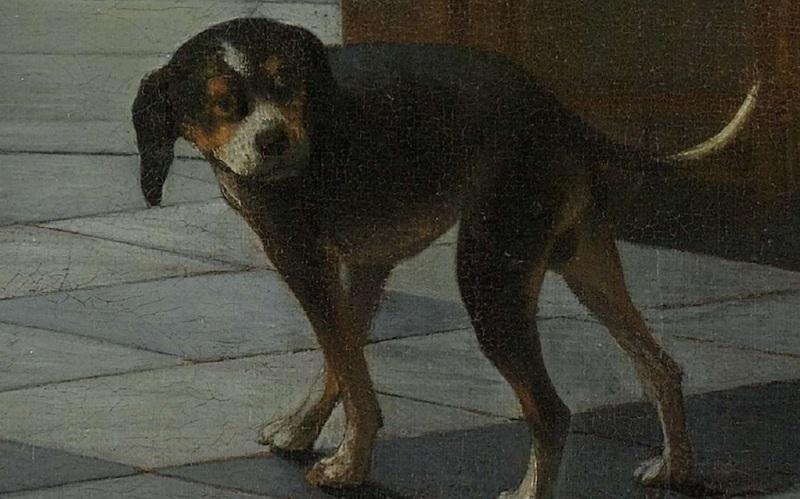 В комнате есть еще один персонаж — небольшой пес стоит спиной к подателю письма, как бы уходит, но оглянулся и потихоньку рычит. Он очень хочет облаять гостя, но не решается: боязно. Его маленький собрат уютно расположился у хозяйки на коленях и спокойно разглядывает посетителя.