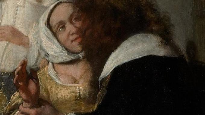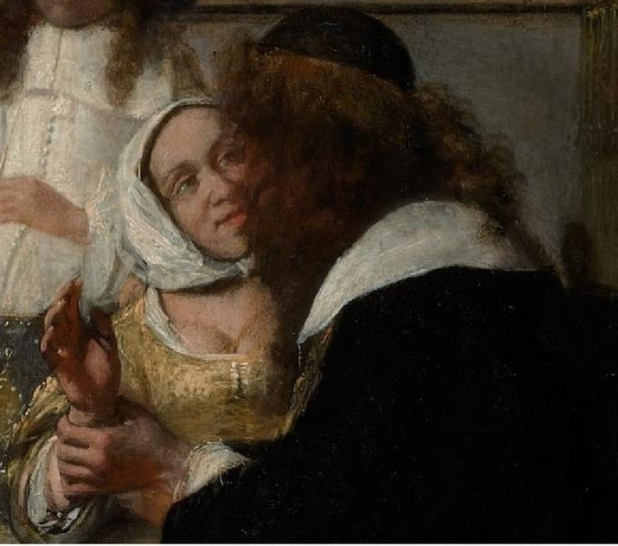 У сидящего спиной к зрителю мужчины на голове черная шапочка (может быть, это кипа, тогда он — еврей). Его черное (довольно богатое) одеяние косвенно говорит о том, что он — не дворянин. Что могло связать состоятельного еврея и бедного дворянина? Крепкая дружба? Вряд ли. Скорее — денежные отношения: дворянин взял взаймы у еврея. И не в первый раз. А в качестве ответной услуги предложил свести его с доступными дамами.