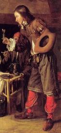 А с чего вдруг юноша расчувствовался? Почему он решил угостить кухарку? Может быть, именно он принес вино, да не очень вовремя — кухарка помешала. И чтобы выполнить задуманное, он решил ее сделать участницей маленькой пирушки? Или ему нужно нечто другое (заметим, что в конюшне есть сеновал, лестница к которому видна в правой части картины). И если это так, то скрытый за фигурами мужчина — сводник? А выпивка — инструмент для достижения цели и средство оплаты услуги? А мальчик в воротах — неожиданная помеха?