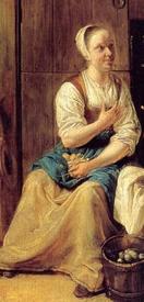 Перед ним сидит кухарка. Она одета для работы: чепчик на гладко зачесанных волосах, фартук, белая блузка с засученными рукавами, жакет со шнуровкой на груди. У нее в левой руке рабочий инструмент, на коленях еще необработанные овощи, в кадушке с водой плавает чистая продукция — похоже, что половина работы сделана.