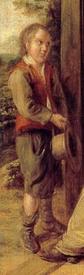 Какое отношение ко всей этой компании имеет непричесанный и как-то небрежно одетый (одна гетра спущена) мальчик в воротах? Может быть, это сын кухарки, который пришел за какой-то надобностью к матери и застал такую сцену? Скорее, это нищий забрел за милостыней, мама привела бы его в порядок.