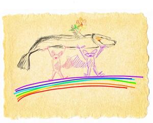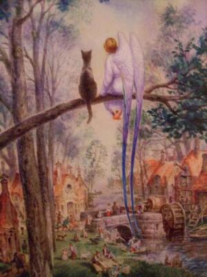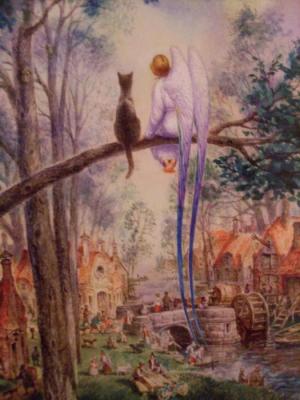 именно розовых и фиолетовых, и радугу, а коты идут по радуге и несут серебряную рыбу на высоко поднятых руках