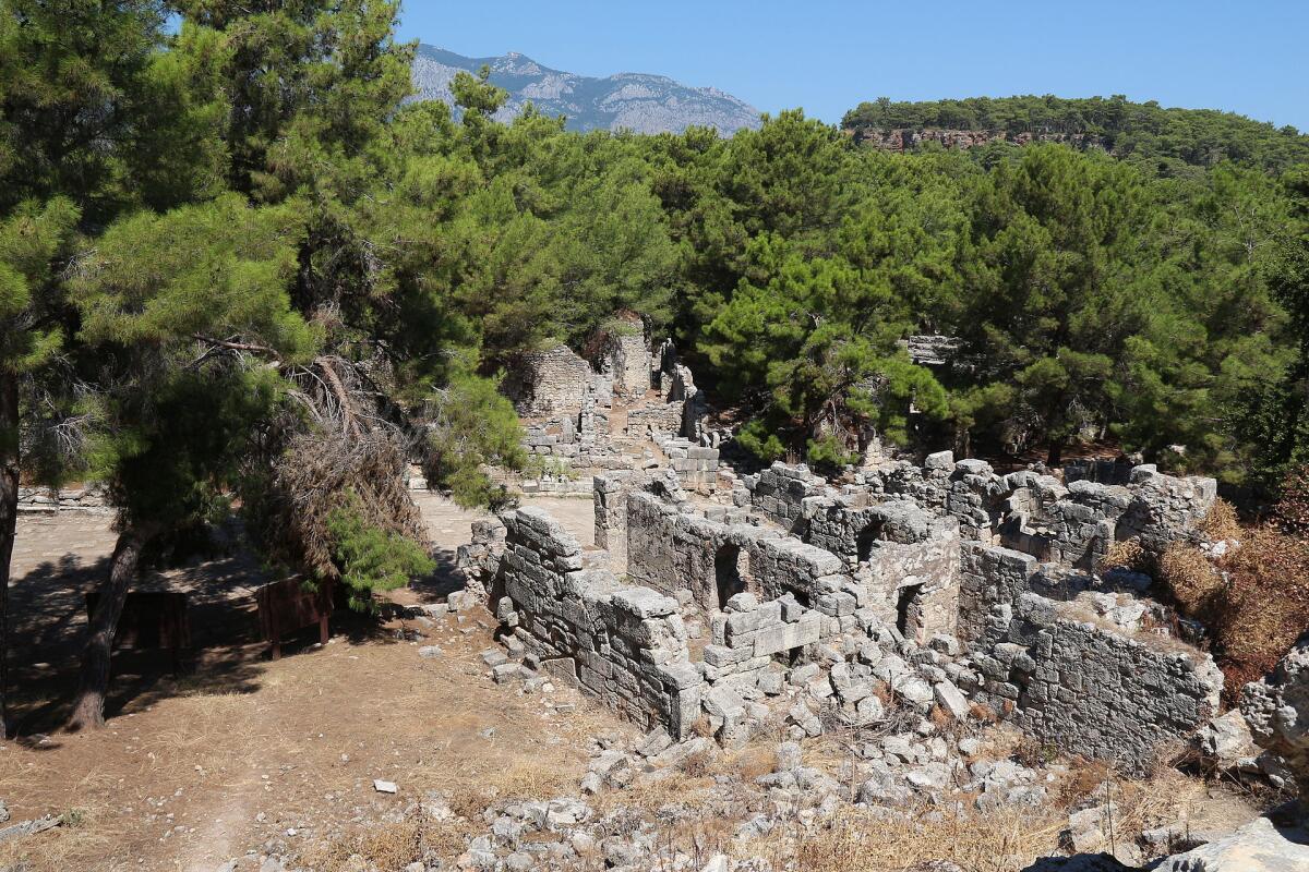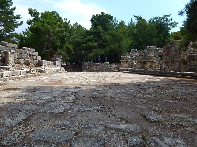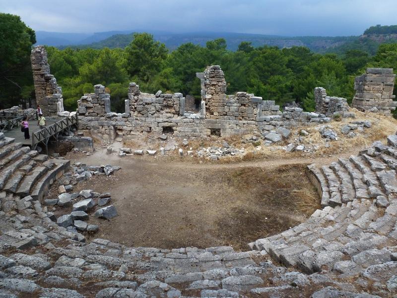 Нас, в отличие от всех остальных туристов, ничто не торопило. И мы не спеша стали подниматься к театру — центру культурной жизни города. Построенный римлянами во 2 веке н.э. и рассчитанный на 3 тыс. человек, он достаточно хорошо сохранился. Очевидно, все его 20 рядов всегда были заполнены до отказа знатью и простым людом. Здесь давали драмы и комедии для Александра и Адриана. Сейчас, в тени сосен, можно было занять любое место в любом ряду и представить себя одним из жителей или гостей Фазелиса. С последних рядов открывался фантастический вид на Тавр (горная цепь), наверное, мало изменившийся за 2 тысячи лет.