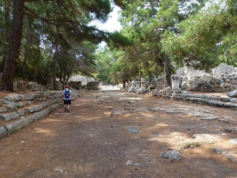Расположившись на берегу средней гавани города, а всего их три, мы не спешили входить в сам город, словно оттягивали удовольствие, находясь в предвкушении уже сбывающейся мечты. Благо времени и пепси у нас было достаточно, чтобы никуда не торопиться. Но древний город предательски манил своими «развалинами» и приглашал, распространяя аромат хвои по своим улицам, как любезный хозяин. К слову сказать, улица, или центральный проспект, в городе был всего один. Нет, в древности их, конечно же, было больше. Но сейчас осмотр города осуществлялся по проспекту шириной метров 20−25, вдоль которого располагались многочисленные бани, лавки и всевозможные административные учреждения. И конечно же, театр, по размерам хоть и уступавший театру Хиераполиса, но по красоте — нет.