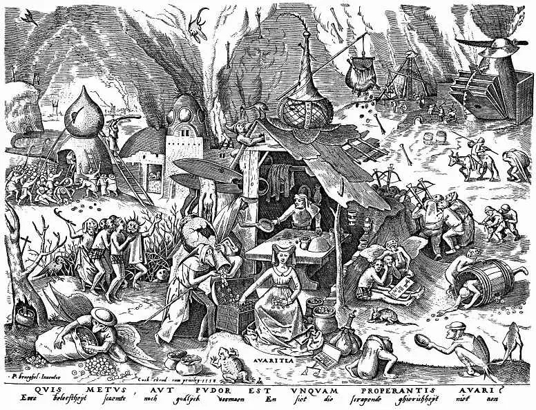 К списку грехов относится алчность, корыстолюбие. Это желание иметь как можно больше материальных благ. Этому греху «подвержены» и бедные, малоимущие, и богатые, обладающие материальными ценностями, но которым «всё мало».