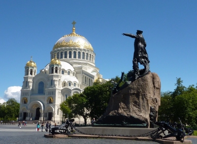 Хорошая статья! До Кронштадта можно доехать еще и обычным городским автобусом № 101 от метро Старая деревня, за 28 рублей,автобусы ходят по расписанию каждые 10-11 минут, время в пути около часа, путь идет по дамбе, которую тоже интересно посмотреть, тем более, что с нее прекрасно обозреваются и форты перед Кронштадтом. По Кронштадту надо ходить пешком, потому что там очень много замечательных памятников.Вот снимок Морского собора и памятника Адмиралу Макарову.
