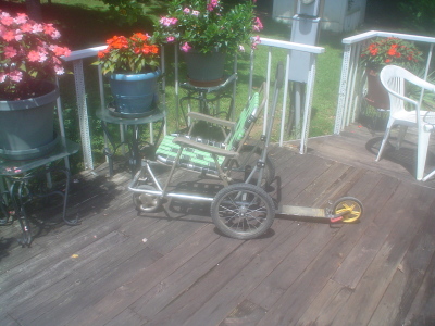 Собрал из двух старых сумок-тележек, сломанного дочкиного велосипеда (все их видели или своих детей-внуков к двум колёсам приучали) и мотора от старой газонокосилки подобие мини-трактора, а двухкнопочный выключатель приспособил в качестве дистанционного пульта, теперь балдею на лавочке с пивом, а тёща мне теперь ещё и сама пиво носит, потому-что мой балдёж пользу приносит.