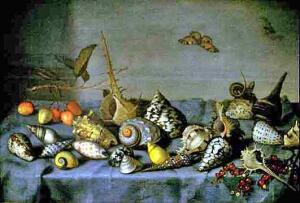 «Накрытый стол», О. Берт Старший. Устрицы, артишоки в корзинке, бокал с вином, кувшин, булочка, солонка и оливки на тарелке. Интерпретация в ключе эротической символики представит большую часть этих предметов как знаки кратких и сомнительных плотских удовольствий, однако в XVII в. было известно еще одно значение устриц: вскрытая раковина означала душу, готовую покинуть земную оболочку. Раковины, как и рыбы, традиционно символизировали крещение.
