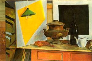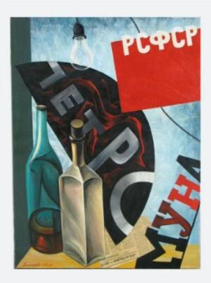 Это "Натюрморт с черным квадратом". Холст, масло; 98Х146 см., 1989. Находится в частной коллекции в Париже. Автор Лев Прыгунов (тот, который Виталий Бонивур и т.п., т.е. актер). В начале 1970-х он начал заниматься живописью.