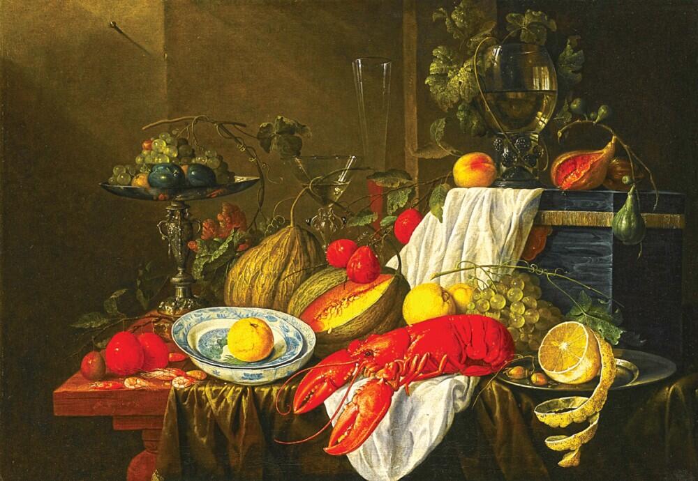 «Натюрморт с омаром», Ян Давидс де Хем. Крупный омар, курительные принадлежности, драгоценная подставка для одного из бокалов, лимоны, устрицы могут символизировать краткие земные удовольствия: рак и омар нередко означали превратность мира, лимон — неверность, в том числе в дружбе и любви, глиняная трубка и табачный дым символизировали бренность плоти.