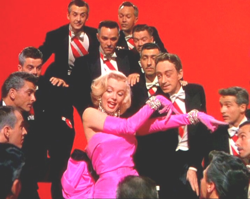 Взять хотя бы фильм 1953 г. «Джентльмены предпочитают блондинок». В одной из сцен героини Монро и Джейн Рассел поют песенку «Two Little Girls from Little Rock», одетые в одинаковые красные платья. Так вот, спереди у этих платьев был такой глубокий v-образный вырез, что доходил прямо до талии. Правда, модельеру Уильяму Травилле пришлось пойти на уступки цензуре и вшить в откровенные декольте трикотаж телесного цвета.