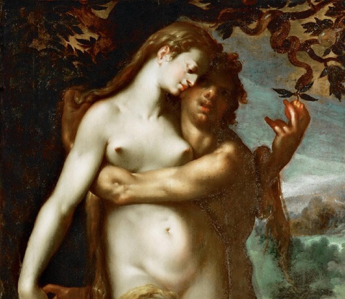На картине Бартоломеуса Спрангера «Грехопадение» мужчина и женщина (надо полагать, Адам и Ева) обнимаются под деревом, с ветки которого свисает змей с яблоком. Ева уже взяла это яблоко, сейчас она его надкусит, а затем даст Адаму.