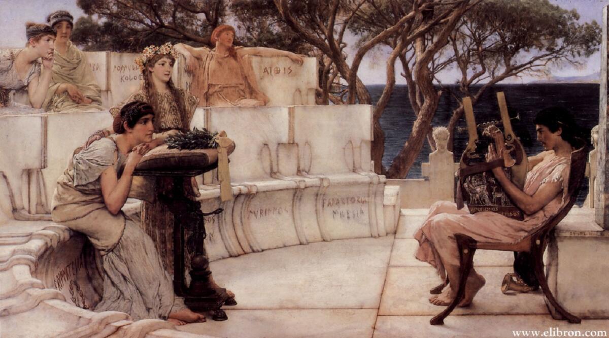 На картине Альма-Тадеме сэра Лоренса — мраморная трибуна с именными местами (видны написанные имена). На заднем плане — море. Два великих поэта античности: справа Алкей, слева Сафо. Алкей с лирой, он поёт и играет. Сафо слушает его, затаив дыхание. Перед ней — заготовленный для поэта лавровый венок. На ступеньках — подруги и воспитанницы Сафо. Они, видимо, не так очарованы поэтом и певцом.