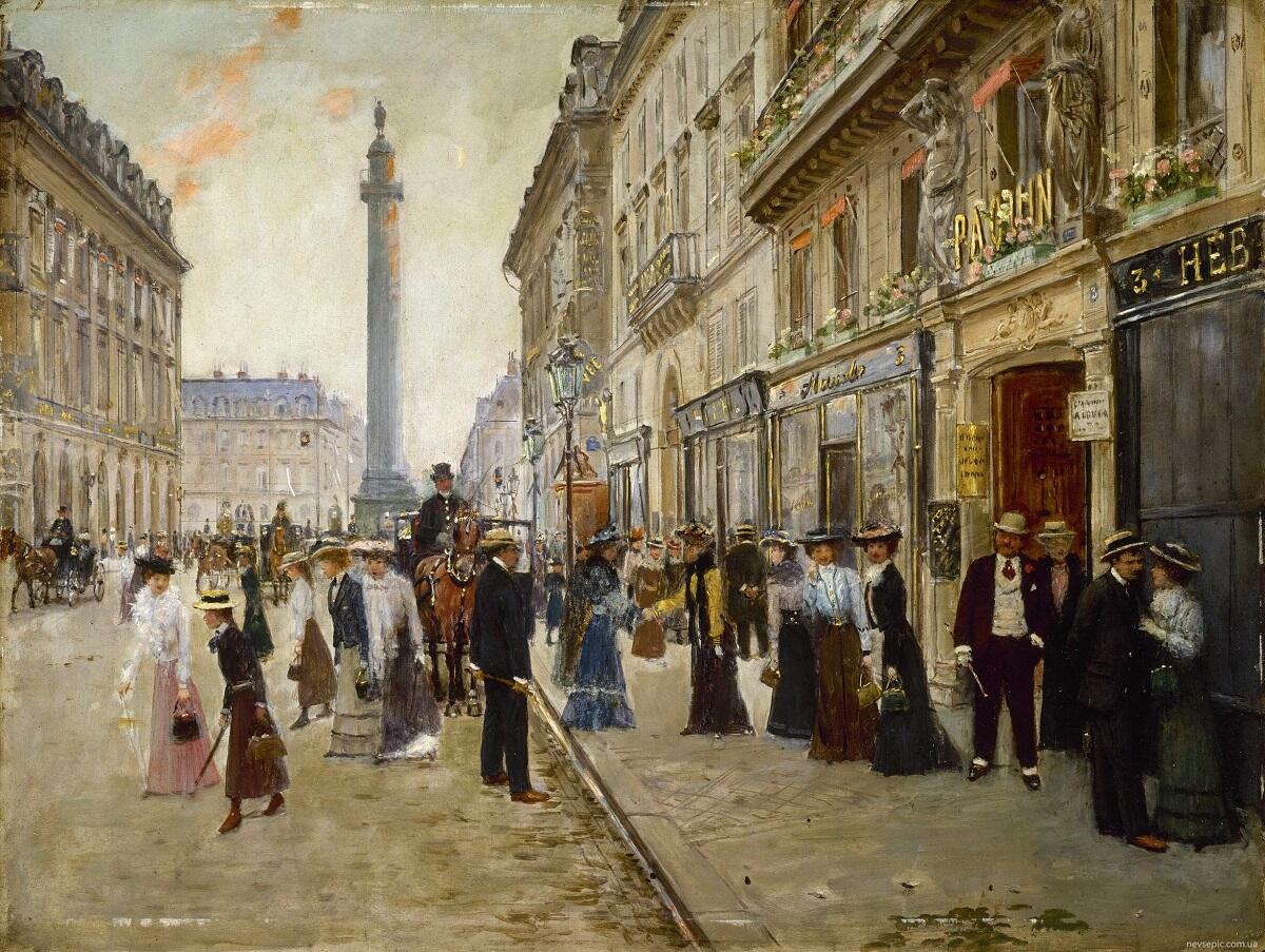Зрительный центр картины — Вандомская колонна, возведенная в память о победах Наполеона. Группа женщин, слегка разбавленная мужчинами, выходит из здания, на фасаде которого между кариатидами видны золотые буквы вывески «Paquin» (Пакен). (Думается, что мужчины — не работники модного дома, они встречают своих подруг-модисток. Разве что пара в проеме двери — муж и жена.)
